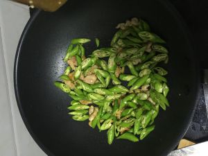 热锅不放油,把青椒倒进去翻炒,炒至辣椒微黄有香味后盛出装盘备用