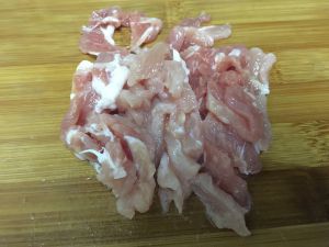 花猪肉洗净,切成长3厘米,宽5毫米,厚5毫米的丝,放生抽与盐、40克淀粉搅拌均匀,腌渍入味。