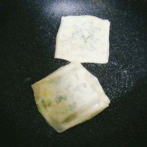 在不粘锅里倒入一点点油,然后将饼放入,中小火烙大概2分钟,之后翻面,中小火烙2分钟,之后盖上锅盖~