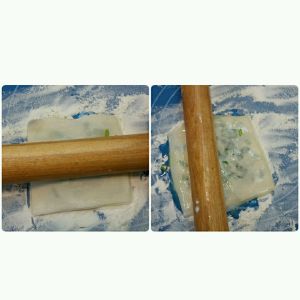 就这样重复,最后盖上一张饺子皮就可以啦(差不多4 , 5张皮就可以了)用手压一下~横向竖向都擀薄