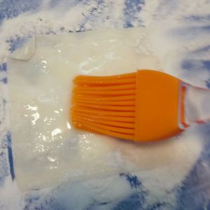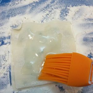 在硅胶垫放一张饺子皮(我撒了些面粉~其实撒不撒都可以的啦)饺子皮上刷一层薄薄的玉米油(得刷均匀哦)