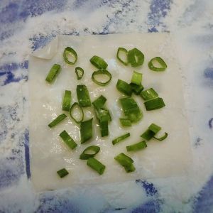 中间铺上调味的葱花,将饺子皮往中间折叠,确定封好口子,让葱花紧紧留在中间。