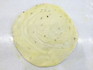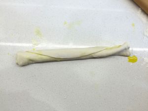 将抹好葱油的饼从一边开始卷,卷成一个长条~