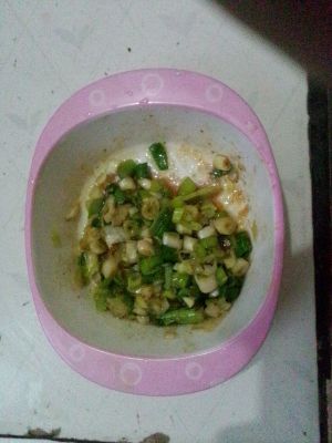 把面和好后饧一会,我们来制作油酥,碗里放入适量的面粉,一勺盐和适量的花椒粉(不喜欢吃的可以不放),倒入加热的色拉油,和成稀油酥,然后加入切碎的葱花拌匀备用。用油酥是为了层次更好,饼的表面也会有一层酥皮很香。