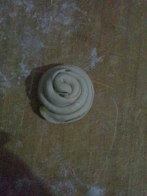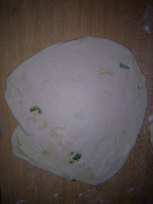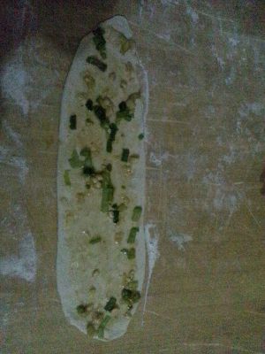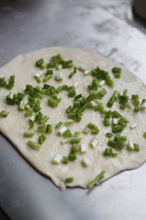 将面分成约一个个均匀的剂子,分个揉圆、在案板上将剂子擀开成面面片。 面片上抹上做好的葱油、均匀地撒上盐、均匀地撒上葱花。