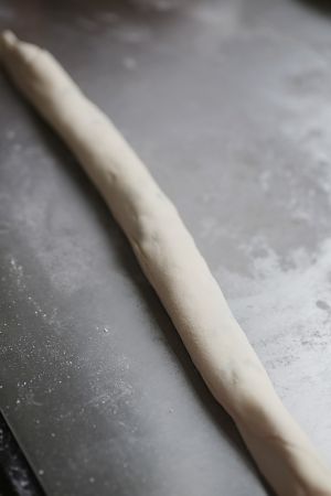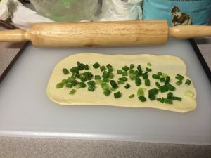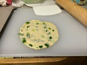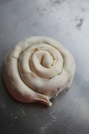 压扁“蚊香”,再用擀面杖推平,面皮不能太薄,否则容易破,葱子全部跑出来不美观,太厚了也会失去爽脆的口感。这个时候撒盐在饼的表面,用小毛刷涂均匀。