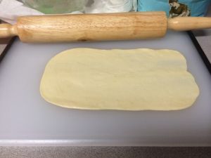 面粉和水调和好后,用擀面杖擀出长方形面皮。