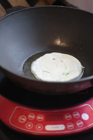 加少许食用油、将饼坯放上煎至一面金黄后翻面至另一面金黄即可。