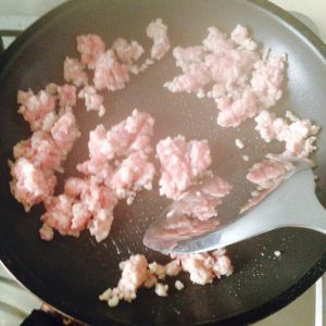 锅里下油加热,放入肉糜炒至断生,再加入葱末一起炒,葱熟就可以了不要炒焦。期间可以再加些盐