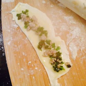 醒好的面分成5个小剂子,擀成竖长面片,抹一层油酥,加上适量炒好的香葱肉糜。
