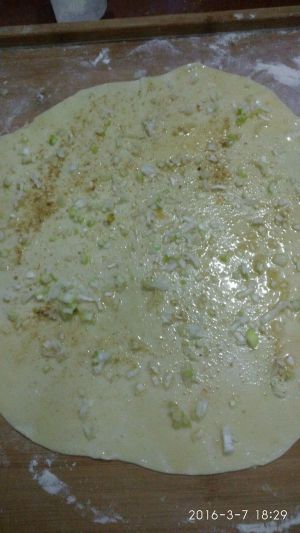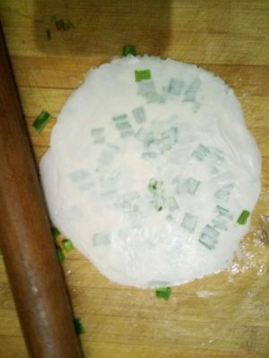剂子擀圆, 依次如下: 1,刷一层食用油, 2,撒一点盐, 3,撒葱花