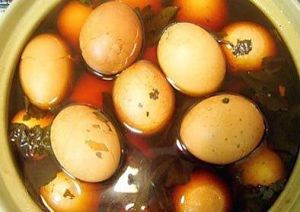 食用时捞出,拣去茶叶渣即可,如以卤汁蘸食则味更佳! 特点:茶叶蛋吸收了五香卤排骨的鲜美,而排骨也有了茶叶的清香。