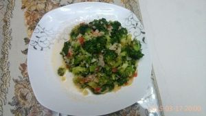 放入西兰花 ,盐一勺半(勺子大小不一样 所以根据个人口味定) 鸡精、味精少许 调味料炒至均匀 就可以出锅了