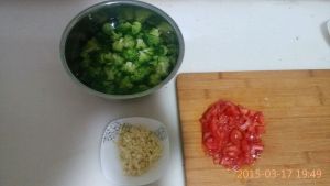 准备原材料,1~西兰花摘好洗净;2~西红柿切碎;3~蒜末切碎点。