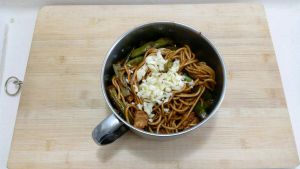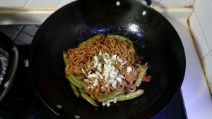 取出蒸好的面放到扁豆上盖锅盖再焖5分钟,用铲子将面和扁豆炒匀,让面条均匀的裹上汤汁,放上蒜末,淋香油就可以出锅啦。