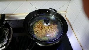 挂面放在蒸锅上蒸5分钟,期间在面上撒些水,防止面蒸完之后太干