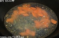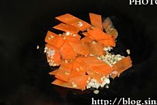 热锅上油,下姜蒜末爆香,加入胡萝卜片翻炒。