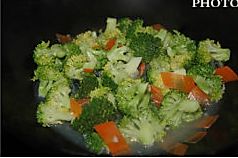 煎蛋清的锅内放少许油,烧烫后放入滤过水的西兰花,翻炒一下
