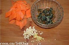 胡萝卜去皮洗净切菱形,皮蛋切丁,蒜剁蓉。