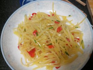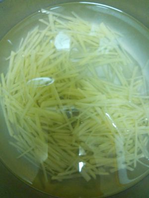 土豆切丝后放水中,油入锅时捞起沥干使用。