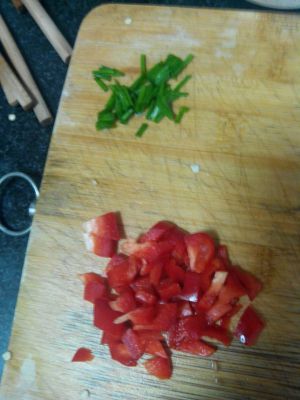 锅烧干之后倒入植物油,油热后放辣椒,放土豆丝。土豆丝变软时加入醋,盐,炒匀放入葱段起锅。