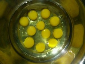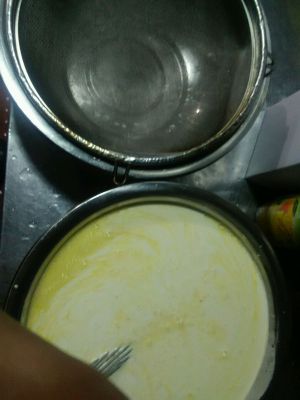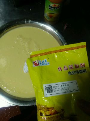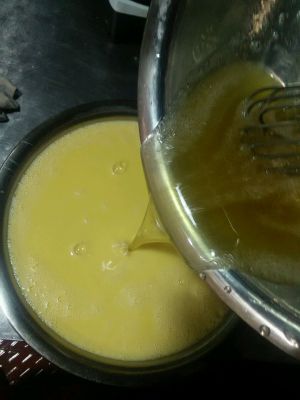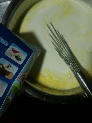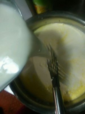 将加热过的牛奶混合液加入蛋液中,搅拌均匀!