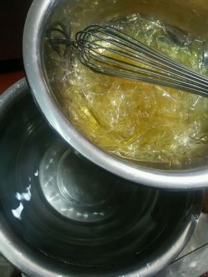 将泡软的吉利丁片捞出隔热水融化,或者是放入微波炉加热至融化!