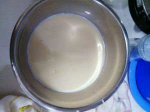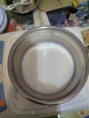 混合牛奶,淡奶油, 隔热水小火加热。