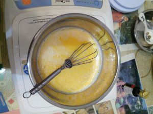 把鸡蛋倒去奶液中,和匀。