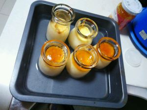 糖加热呈焦黄色,关火。倒入小瓶内。 在倒入布丁液。 放入烤盘,烤盘加水,过小瓶一半。 烤箱170度,35分钟。 果酱加2勺水,加热,融化后,加在布丁上。 放冰箱冷藏。