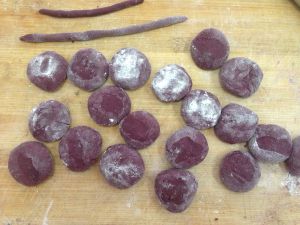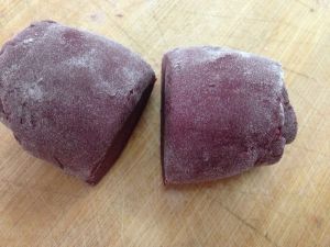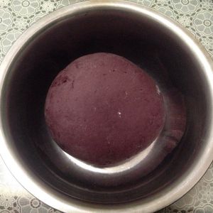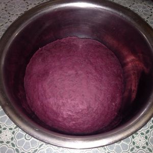 白面和紫薯粉混合,将酵母用温水完全融化倒入混合面粉中,以牛奶代替水加糖把面粉揉成面团。