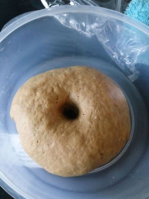 和好的面团放入盆中,盖上湿布子根据环境温度饧发2小时左右(冬季可放入烤箱低温发酵2小时) 饧好的面团是原来的1.5至2倍