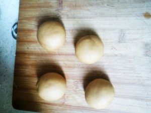 将发酵好的面团均匀分成四份。