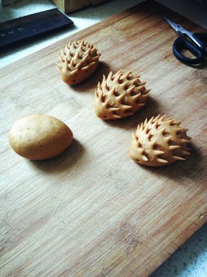 捏出刺猬形状,用剪刀在背后剪出刺猬的刺,并用牙签戳出刺猬的眼睛。