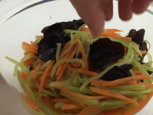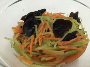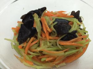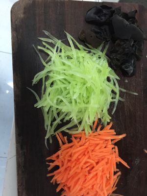 准备好的莴笋去皮切丝。切好的莴笋丝放入一勺盐腌制一下,出水后清水洗一下,挤干水份备用;
