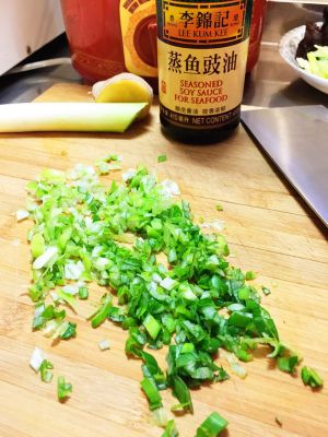 然后把盘子底摆上一层葱姜蒜的片,将腌好的鱼头捞出,沥干上面的胡椒粒,放到盘中,要特别在鱼的嘴边摆上姜(防腥的),水开上锅蒸20分钟,出锅后均匀淋上蒸鱼豉油,撒上葱末。