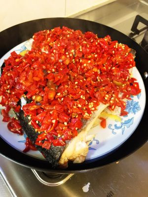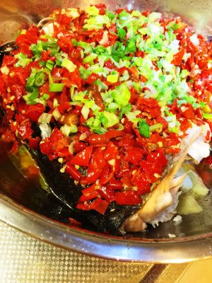 把爆香的辣椒均匀铺好在鱼头上面,淋上一点蒸鱼豉油,蒸10-12分钟左右