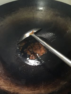 锅中一小碗水,并倒入糖,熬至变成浅焦糖色,之后倒入排骨