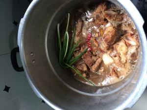 倒入高压锅内放葱开始压