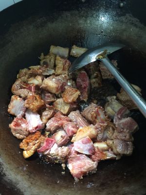 排骨捞出后控水备用,开炒,锅中放油加热,小起泡时候加入白砂糖炒化,然后加入排骨翻炒,使每块排骨都沾上糖色,小火慢慢煎,然后加入葱姜和八角,翻炒至排骨煎至变颜色。