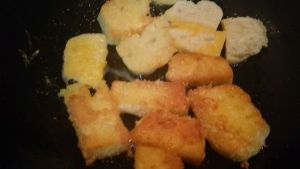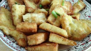 锅内放油,油热时小火,用双筷子将馒头片放入蛋液内蘸一下,放入锅内慢慢煎,两面金黄即可。
