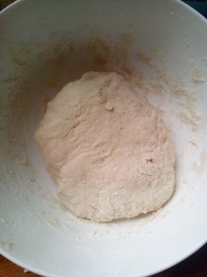 调好的糖水放一边,把面粉倒入大碗中,我倒入的是一个人的量,再倒入糖水搅拌,搅拌成面团,封闭发酵!
