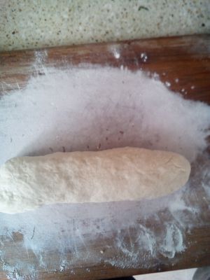 等30分钟面团发酵好后揉成长条状,然后用刀切块。