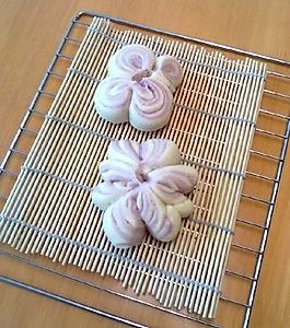 牛奶或者水加热成温水状,打入鸡蛋,加入食用油、酵母搅散后加入面粉揉成光滑的面团。紫薯面团也是这样做,只是事先要将紫薯蒸熟,压碎,调入面团中即可。带醒发后就可以按照下面的步骤来做花样馒头了