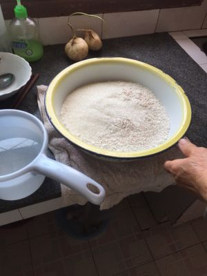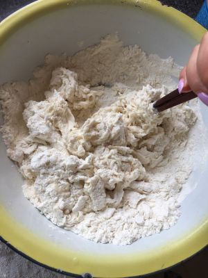 面粉与泡打粉和糖混合,同样也一分为二,分别与酵母水揉合成面团。
