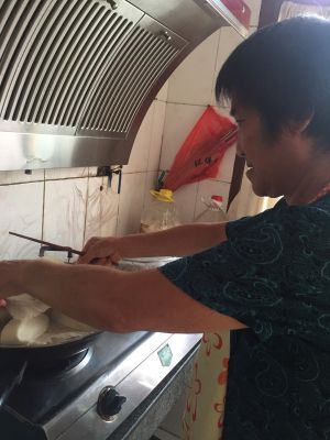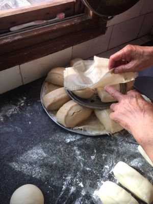 发好的面团取出来在案板上加面粉揉搓,这叫炝面,这样做出来的馒头很劲道。