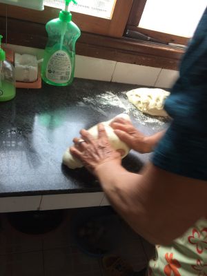 冬天将牛奶温热,放入酵母化开,和其他食材混合成白色面团