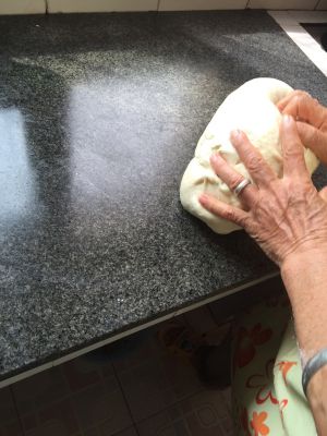 把发酵好的面团发出来开始揉面,粘手就要一边揉一边放点油,最好是植物油。