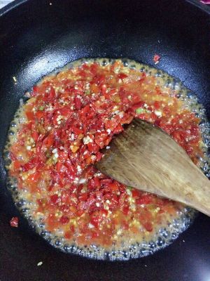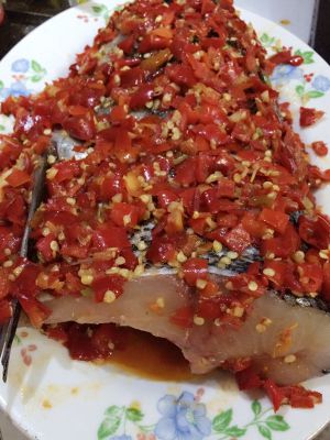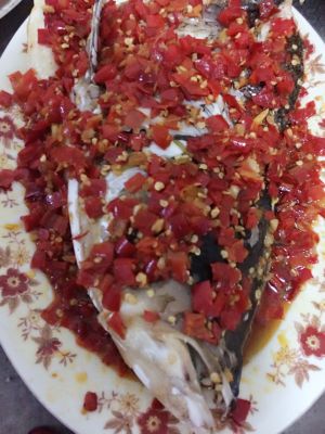 第五步:将做好的剁椒酱均匀放置鱼头上面