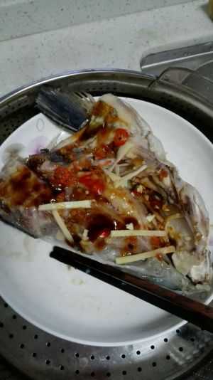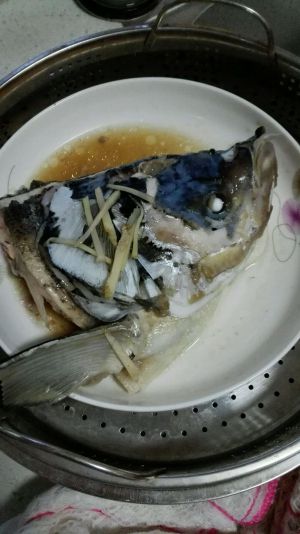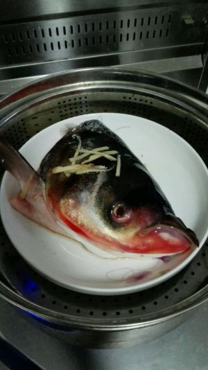 将姜丝洒在鱼头上,剁椒平铺在鱼头上,水开后入锅蒸15分钟